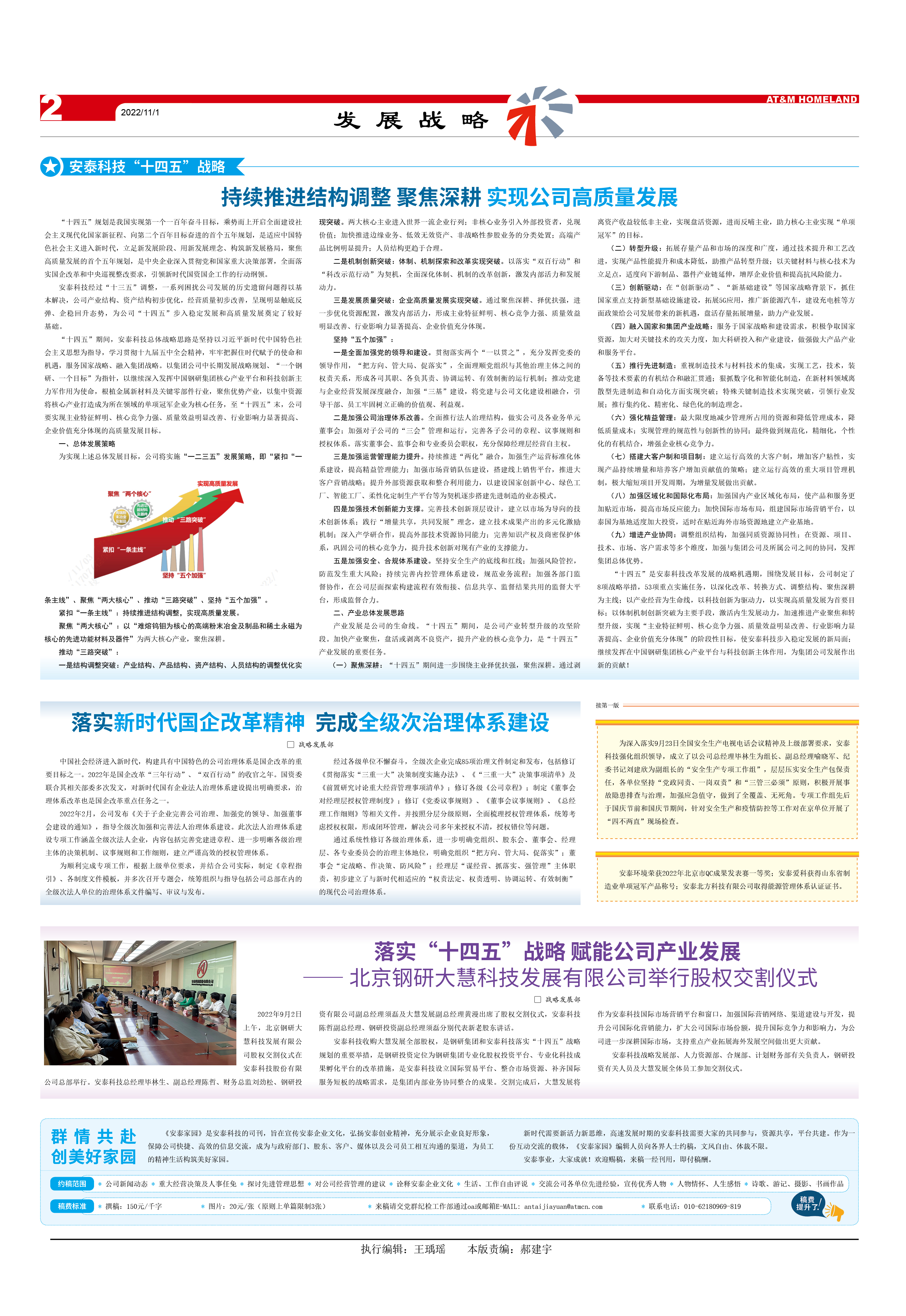 “十四五”是安泰科技改革發(fā)展的戰(zhàn)略機(jī)遇期,圍繞發(fā)展目標(biāo),公司制定了8項(xiàng)戰(zhàn)略舉措,53項(xiàng)重點(diǎn)實(shí)施任務(wù),以深化改革、轉(zhuǎn)換方式、調(diào)整結(jié)構(gòu)、聚焦深耕為主線;以產(chǎn)業(yè)經(jīng)營為生命線,以科技創(chuàng)新為驅(qū)動(dòng)力,以實(shí)現(xiàn)高質(zhì)量發(fā)展為首要目標(biāo);以體制機(jī)制創(chuàng)新突破為主要手段,激活內(nèi)生發(fā)展動(dòng)力,加速推進(jìn)產(chǎn)業(yè)聚焦和轉(zhuǎn)型升級,實(shí)現(xiàn)“主業(yè)特征鮮明、核心競爭力強(qiáng)、質(zhì)量效益明顯改善、行業(yè)影響力顯著提高、企業(yè)價(jià)值充分體現(xiàn)”的階段性目標(biāo),使安泰科技步入穩(wěn)定發(fā)展的新局面;繼續(xù)發(fā)揮在中國鋼研集團(tuán)核心產(chǎn)業(yè)平臺與科技創(chuàng)新主體作用,為集團(tuán)公司發(fā)展作出新的貢獻(xiàn)!