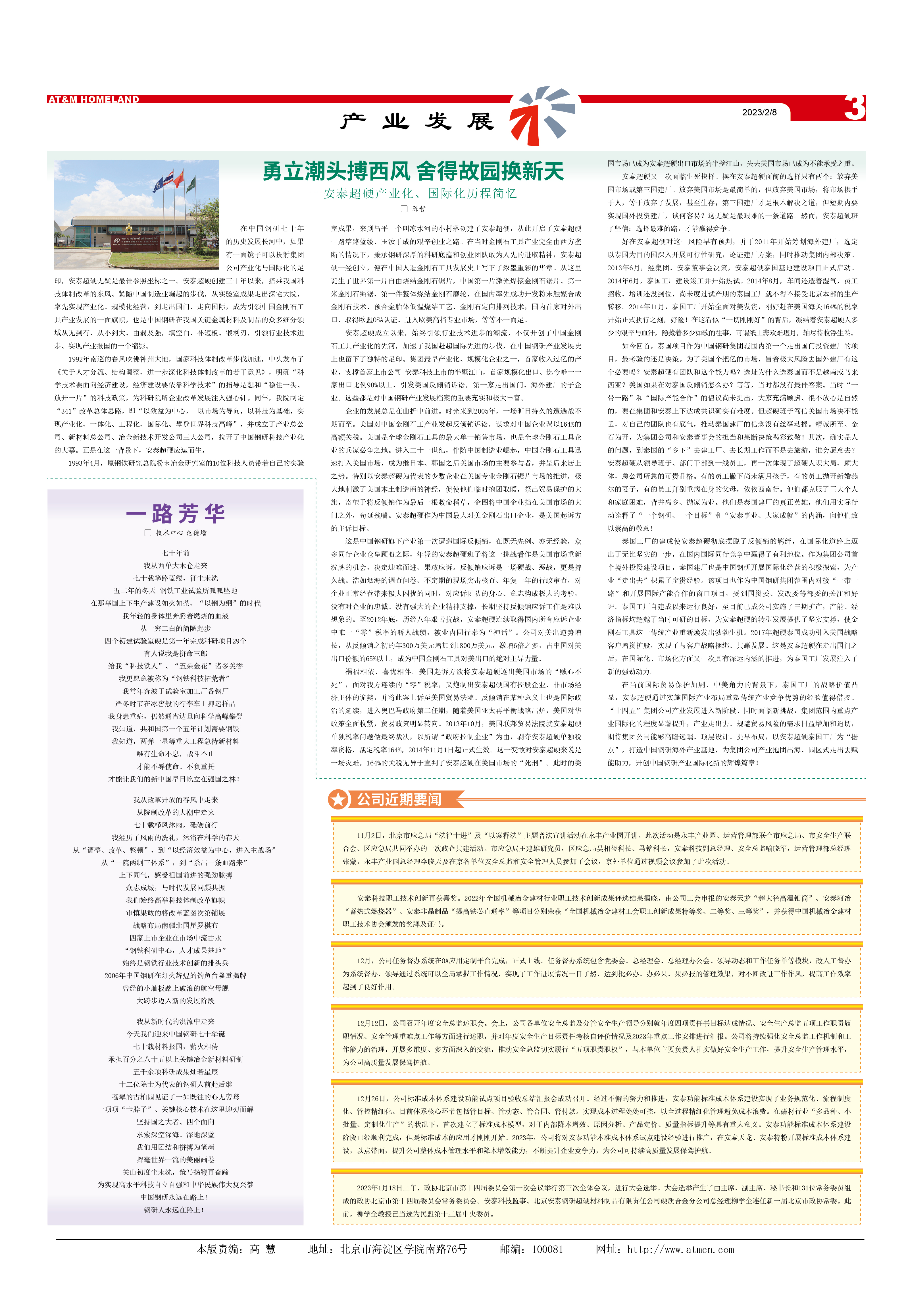 安泰超硬成立以來,始終引領行業(yè)技術進步的潮流,不僅開創(chuàng)了中國金剛石工具產(chǎn)業(yè)化的先河,加速了我國趕超國際先進的步伐,在中國鋼研產(chǎn)業(yè)發(fā)展史上也留下了獨特的足印。集團最早產(chǎn)業(yè)化、規(guī)?;髽I(yè)之一,首家收入過億的產(chǎn)業(yè),支撐首家上市公司-安泰科技上市的半壁江山,首家規(guī)?;隹凇⑵裎ㄒ灰患页隹诒壤?0%以上、引發(fā)美國反傾銷訴訟,第一家走出國門、海外建廠的子企業(yè)。這些都是對中國鋼研產(chǎn)業(yè)發(fā)展檔案的重要充實和極大豐富。