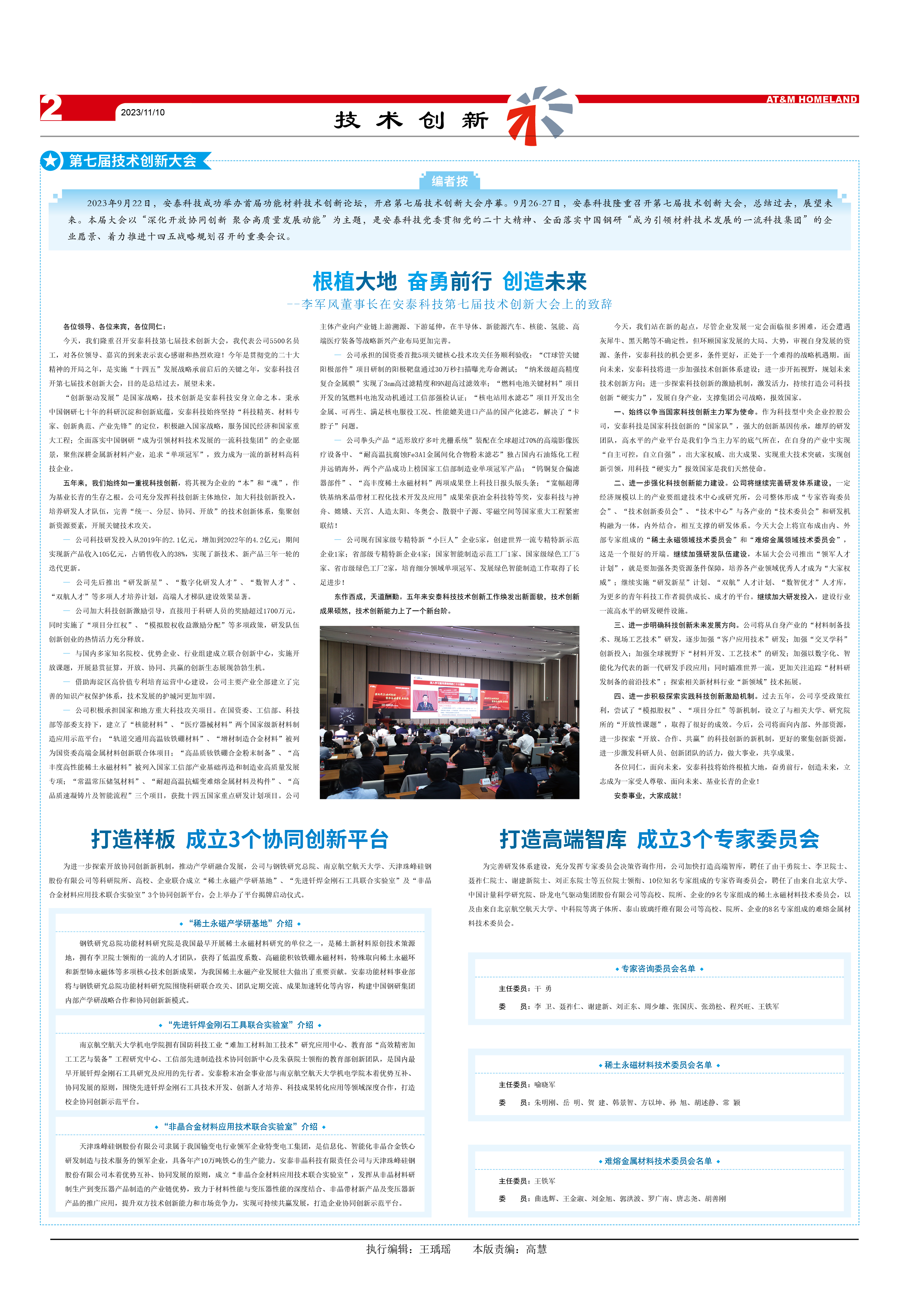 2023年9月22日,安泰科技成功舉辦首屆功能材料技術(shù)創(chuàng)新論壇,開啟第七屆技術(shù)創(chuàng)新大會(huì)序幕。9月26-27日,安泰科技隆重召開第七屆技術(shù)創(chuàng)新大會(huì),總結(jié)過(guò)去,展望未來(lái)。本屆大會(huì)以“深化開放協(xié)同創(chuàng)新 聚合高質(zhì)量發(fā)展動(dòng)能”為主題,是安泰科技黨委貫徹黨的二十大精神、全面落實(shí)中國(guó)鋼研“成為引領(lǐng)材料技術(shù)發(fā)展的一流科技集團(tuán)”的企業(yè)愿景、著力推進(jìn)十四五戰(zhàn)略規(guī)劃召開的重要會(huì)議。